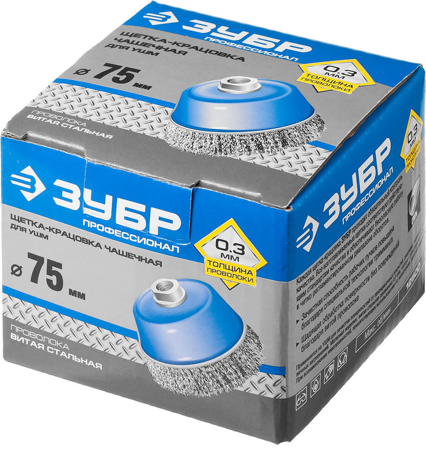 ЗУБР "ПРОФЕССИОНАЛ". Щетка чашечная для УШМ, витая стальная проволока 0,3мм, 75ммхМ14