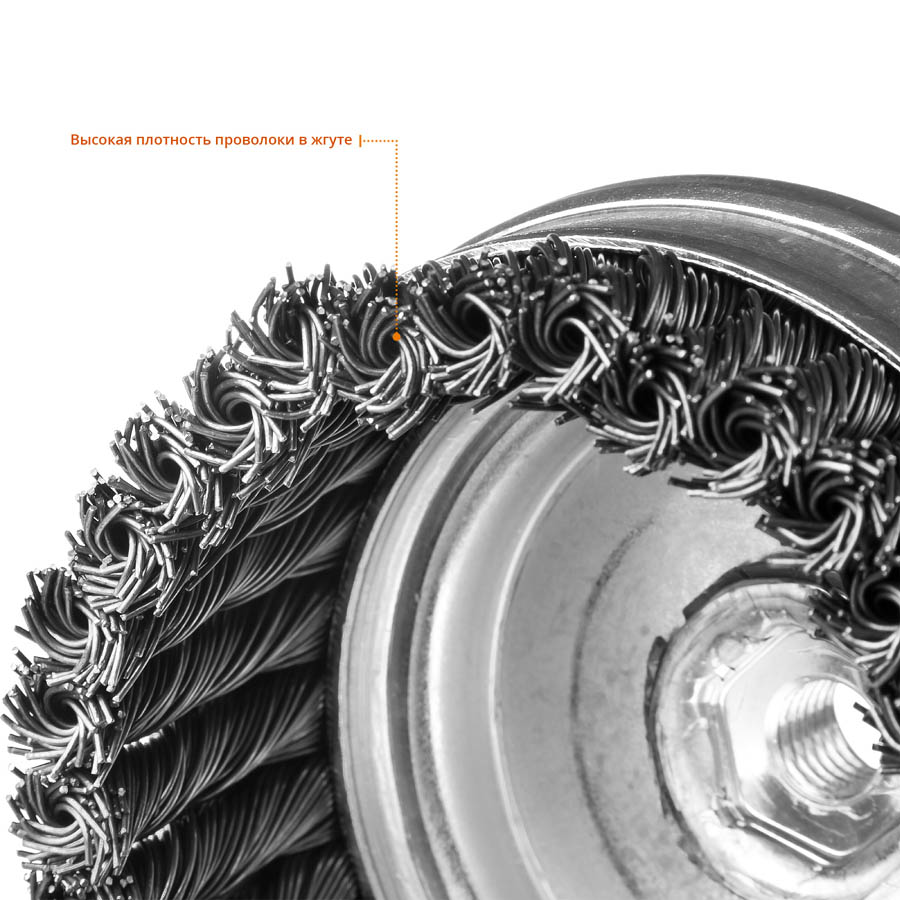 Усиленная щетка чашечная для УШМ ЗУБР 3527-120_z02, предназначена для зачистки поверхностей от лакокрасочных покрытий, ржавчины, окалины, различных стойких загрязнений, а также для зачистки сварных швов. Каждая щетка-крацовка ЗУБР проходит обязательный контроль качества. Все изготавливаемые щетки соответствуют действующим стандартам качества и обеспечивают безопасную работу в четко регламентированном диапазоне оборотов. Стальная жгутированная проволока. Повышенный ресурс щетки благодаря еще более высокой жесткости сплетенного пучка и увеличенной толщине проволоки.