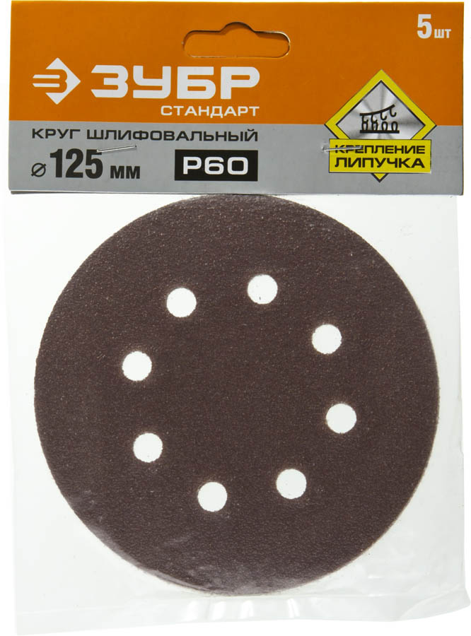 Круг шлифовальный ЗУБР "СТАНДАРТ" из абразивной бумаги на велкро основе, 8 отв., Р60, 125мм, 5шт