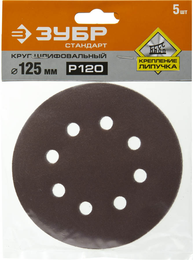 Круг шлифовальный ЗУБР "СТАНДАРТ" из абразивной бумаги на велкро основе, 8 отв., Р120, 125мм, 5шт