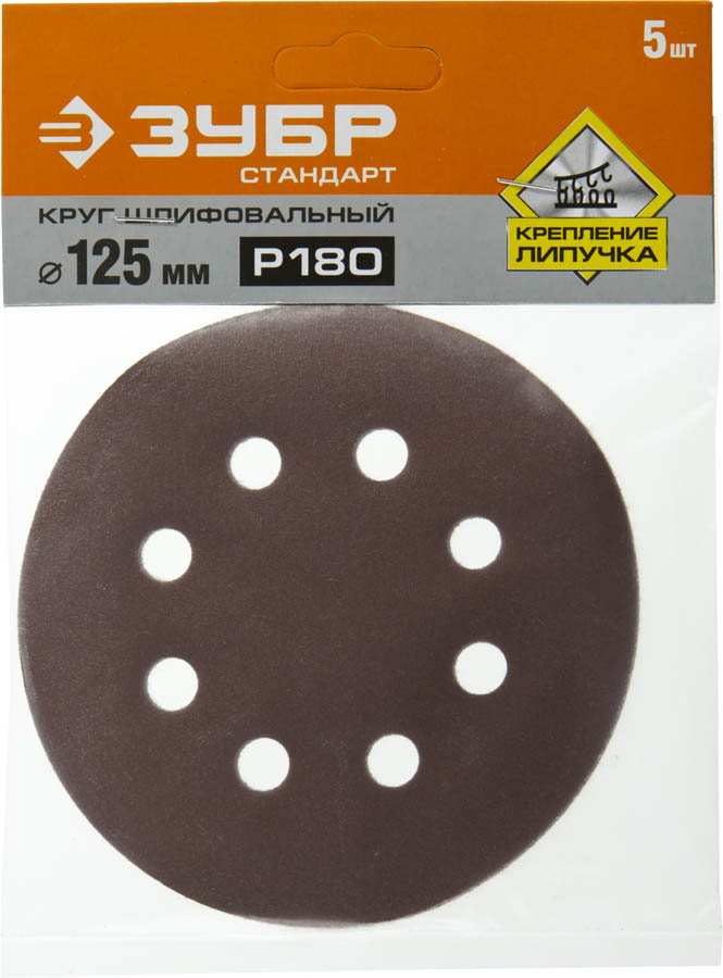 Круг шлифовальный ЗУБР "СТАНДАРТ" из абразивной бумаги на велкро основе, 8 отв., Р180, 125мм, 5шт