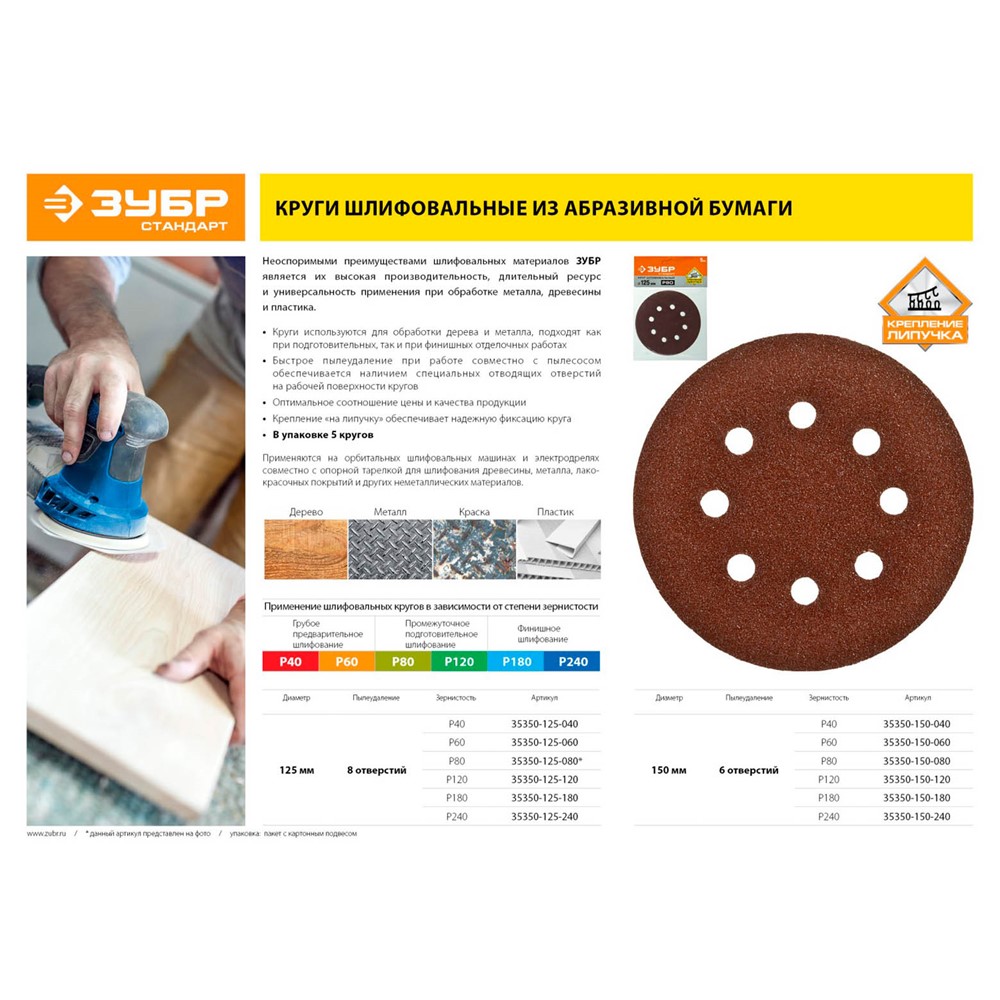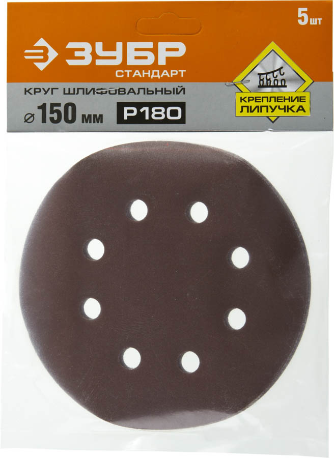 Круг шлифовальный из абразивной бумаги, ЗУБР Стандарт 35350-150-180, на велкро основе, 6 отв., Р180, 150мм, 5шт