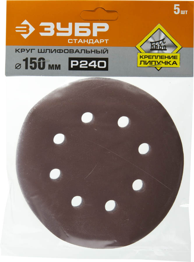 Круг шлифовальный из абразивной бумаги, ЗУБР Стандарт 35350-150-240, на велкро основе, 6 отв., Р240, 150мм, 5шт