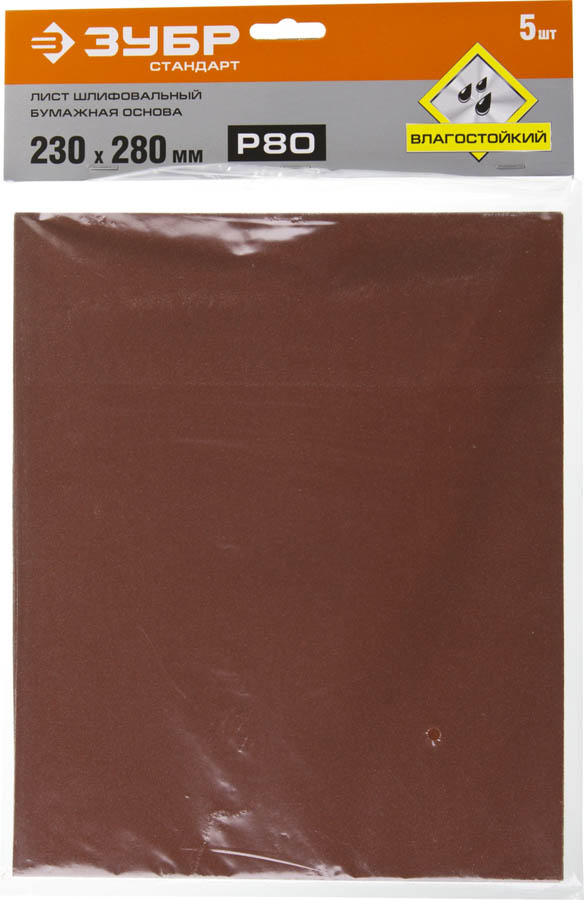 Лист шлифовальный ЗУБР "СТАНДАРТ" на бумажной основе, водостойкий 230х280мм, Р80, 5шт