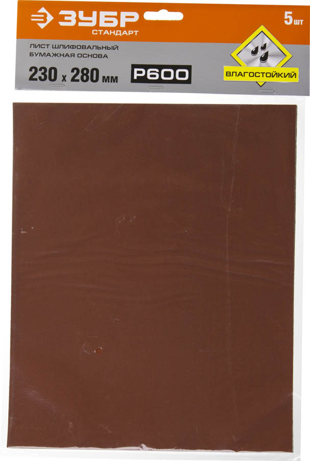 Лист шлифовальный ЗУБР "СТАНДАРТ" на бумажной основе, водостойкий 230х280мм, Р600, 5шт