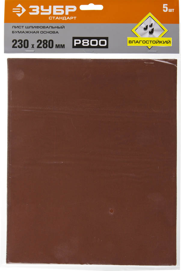 Лист шлифовальный ЗУБР "СТАНДАРТ" на бумажной основе, водостойкий 230х280мм, Р800, 5шт