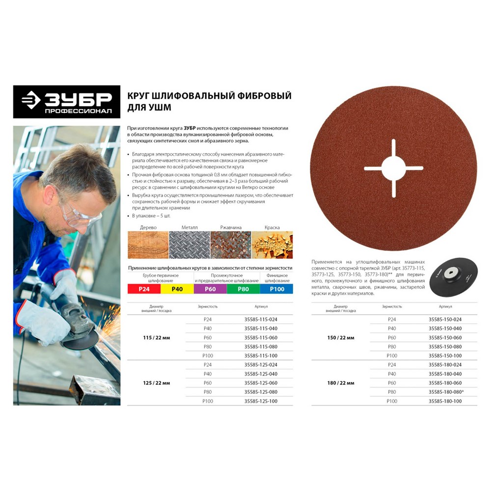 ЗУБР P40, 115х22 мм, 5 листов, круг шлифовальный фибровый для УШМ ПРОФИ 35585-115-040