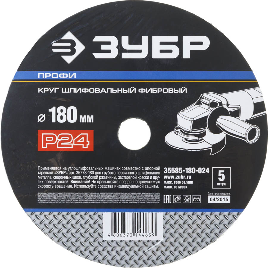 ЗУБР P24, 180х22 мм, 5 листов, круг шлифовальный фибровый для УШМ ПРОФИ 35585-180-024