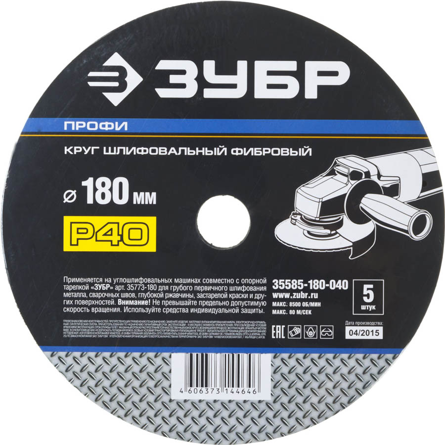 ЗУБР P40, 180х22 мм, 5 листов, круг шлифовальный фибровый для УШМ ПРОФИ 35585-180-040