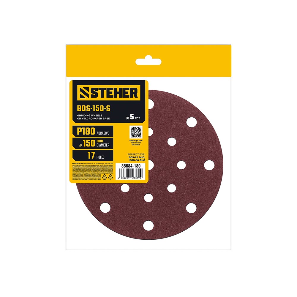 STEHER BOS-150-S 150 мм, Р180, шлифовальный круг на липучке, 17 отв., 5 шт. (35684-180)
