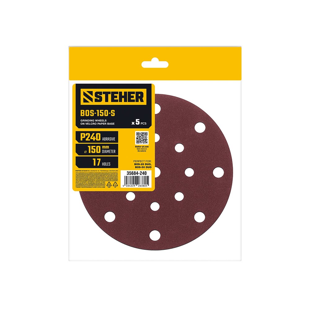 STEHER BOS-150-S 150 мм, Р240, шлифовальный круг на липучке, 17 отв., 5 шт. (35684-240)