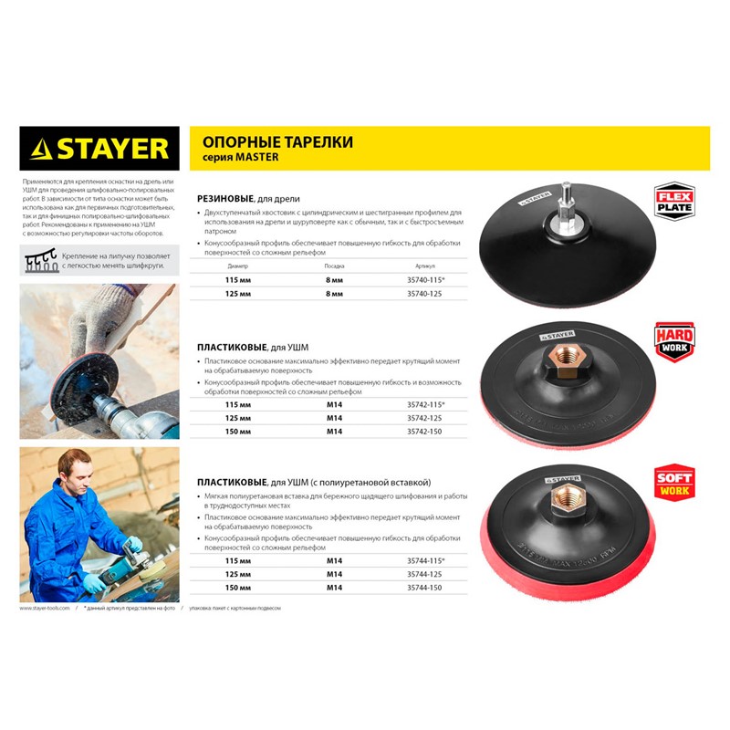 Тарелка опорная STAYER "MASTER" пластиковая для УШМ на липучке, полиуретановая вставка, d=150 мм, М14