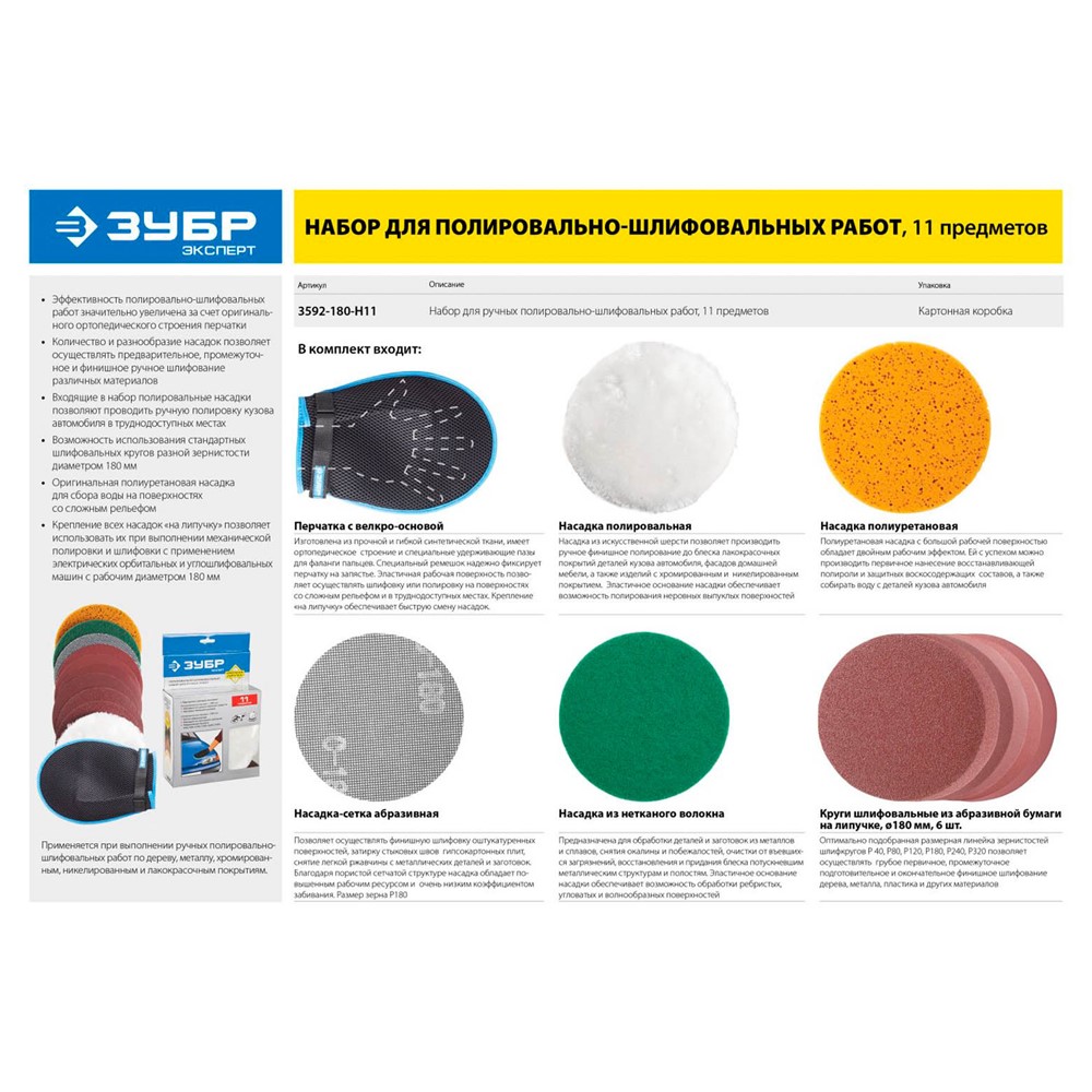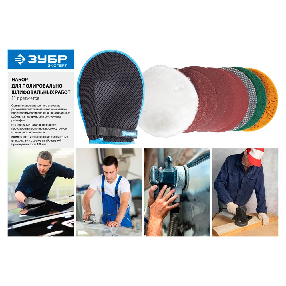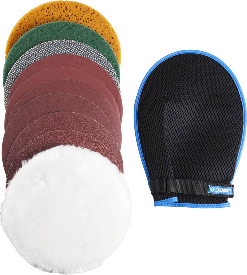 Набор полировальных насадок ЗУБР 3592-180-H11, применяется для выполнения ручных шлифовальных, зачистных и полировальных работ по дереву, металлу и пластику. Оригинальное внутренне строение рабочей перчатки позволяет эффективно производить полировально-шлифовальные работы на поверхностях со сложным рельефом.