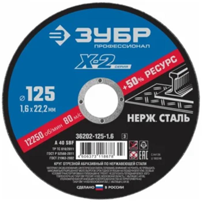 Круг отрезной ″X-2″ по нержавеющей стали, 125х1,6х22,23мм, ЗУБР 36202-125-1.6_z03_X
