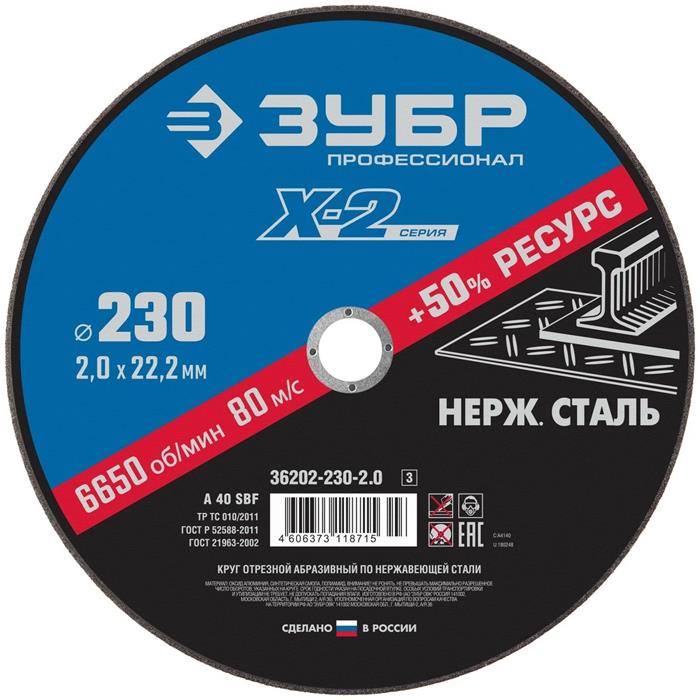Круг отрезной ″X-2″ по нержавеющей стали, 230х2,0х22,23мм, ЗУБР (36202-230-2.0_z03_X)