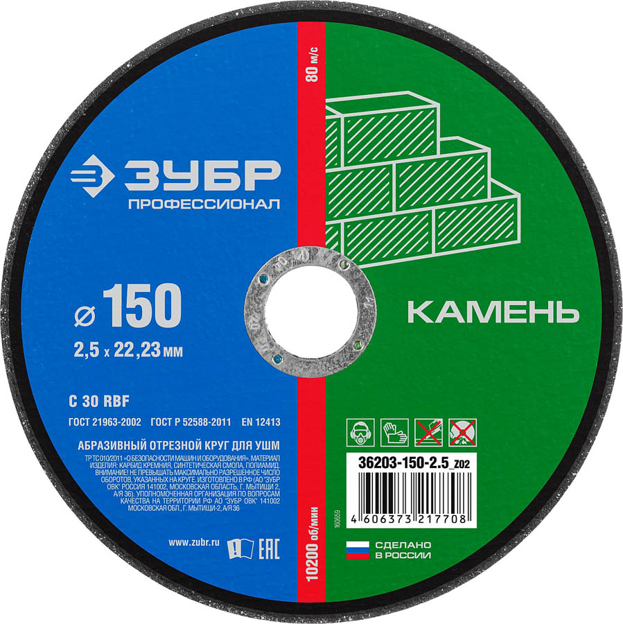 Круг отрезной по камню ЗУБР 36203-150-2.5_z02, предназначены для высокопроизводительной резки бетона, армированного бетона, а также природного и искусственного камня. Круги изготовлены в Российской Федерации на современном оборудовании по оригинальной технологии и рецептуре. Соответствуют всем действующим стандартам качества ГОСТ Р и требованиям по безопасности ЕАС.