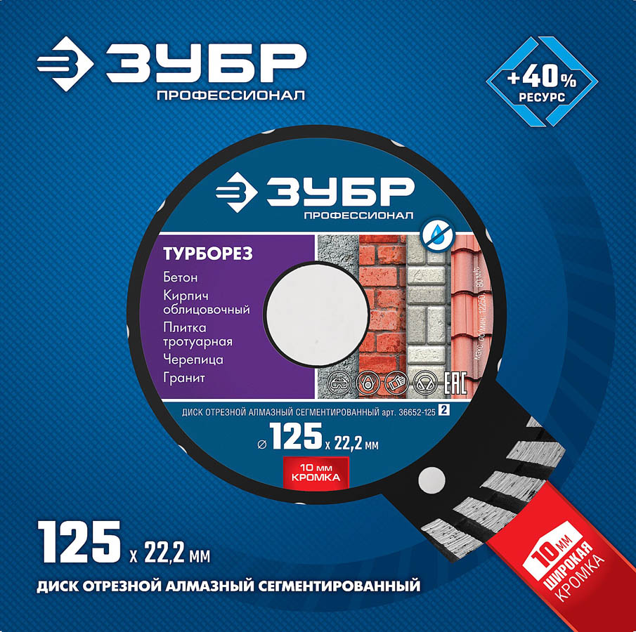 Диск отрезной алмазный сегментированный для УШМ 125 х 22.2 мм, ЗУБР 36652-125_z02, предназначен для резки бетона, бордюрного камня, облицовочного кирпича, тротуарной плитки и других строительных материалов без принудительного охлаждения. Корпуса алмазных кругов изготовлены из прочной легированной стали, способной выдержать значительную механическую нагрузку и высокую температуру. Оригинальная сегментированная форма режущей кромки позволяет быстро и эффективно осуществлять необходимые резы в обрабатываемом материале. Высококачественные синтетические алмазы. Оптимально подобранные компоненты металлической связки с высотой сегмента в 10 мм гарантируют продолжительный рабочий ресурс круга при работе даже с самыми сложными в обработке материалами. Высокая скорость реза и увеличенный рабочий ресурс круга обеспечиваются особой технологией горячего спекания. Минимизация бокового трения благодаря сегментированной форме режущей кромки.