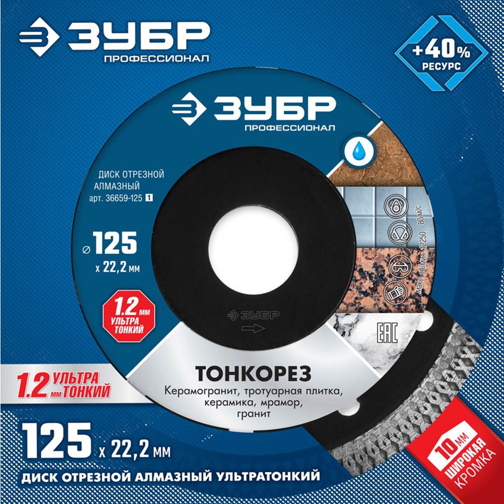 Диск отрезной алмазный 125 х 22.2 мм, ЗУБР 36659-125_z01, предназначен для резки керамогранита, твердой и мягкой керамической плитки, искусственного и натурального камня, мрамора при обязательном водяном охлаждении. Корпуса алмазных кругов изготовлены из прочной легированной стали, способной выдержать значительную механическую нагрузку и высокую температуру. Супертонкая режущая кромка обеспечивает высокую скорость резки и аккуратный точный распил плитки без трещин и сколов. Специальная форма режущей кромки обеспечивает лучшее охлаждение круга во время работы для большей эффективности использования. Оптимально подобранные компоненты металлической связки с высотой сегмента в 10 мм гарантируют продолжительный рабочий ресурс круга при работе даже с самыми сложными в обработке материалами. Высокая скорость реза и увеличенный рабочий ресурс круга обеспечиваются особой технологией горячего спекания. Высокая концентрация алмазов мелкой фракции обеспечивает идеальную чистоту получаемых кромок. Усиление диска в районе