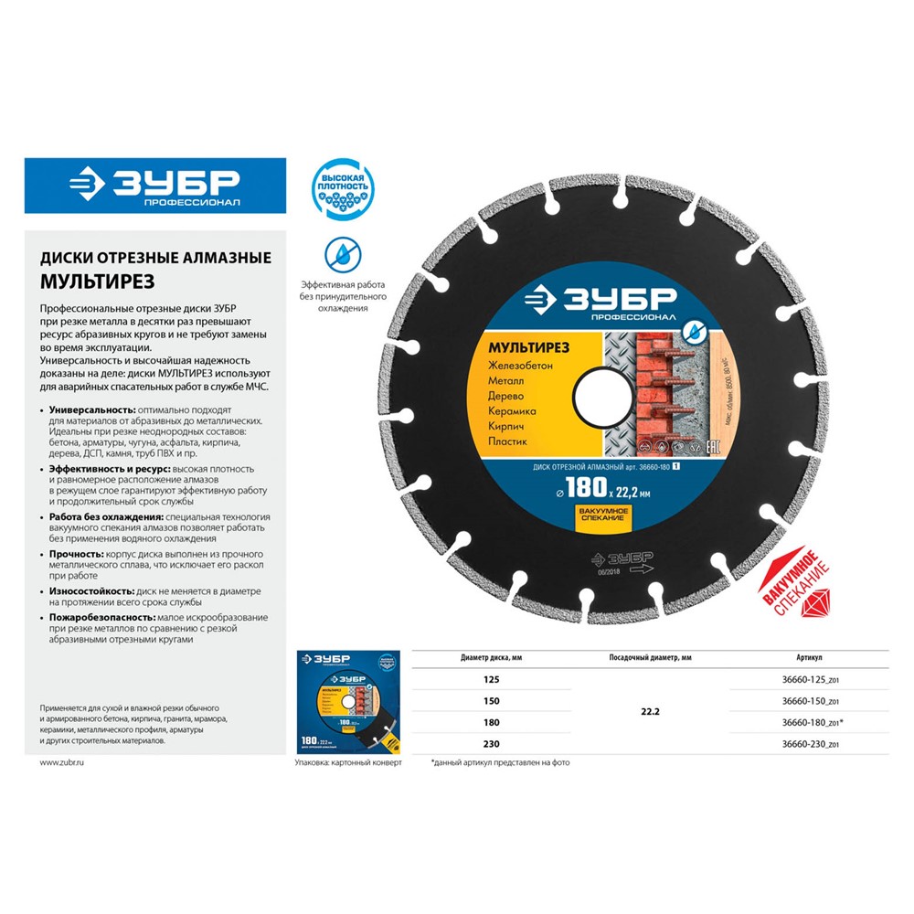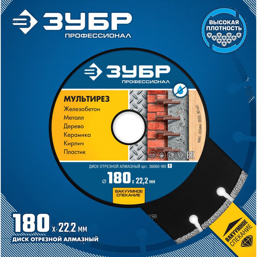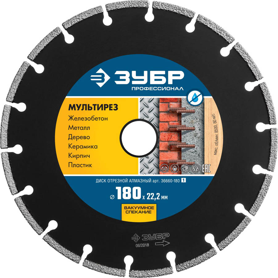 Диск отрезной алмазный 180 х 22.2 мм, ЗУБР 36660-180_z01, сухая и влажная резка бетона, армированного бетона, кирпича, гранита, мрамора, керамики, металлического профиля, арматуры и других строительных материалов. Корпуса алмазных кругов изготовлены из прочной легированной стали, способной выдержать значительную механическую нагрузку и высокую температуру. Новейшая технология ВВС (Высокотемпературное Вакуумное Спекание алмазов) позволяет использовать круг для резки различных материалов, в том числе металлов без обязательного водяного охлаждения. Высокая плотность и равномерное расположение алмазов в режущем слое обеспечивают высокую скорость резки. Универсальность применения: резка различных материалов от абразивных (бетон, кирпич) до металлических профилей и изделий (замки, стержни, дверные петли и пр.).