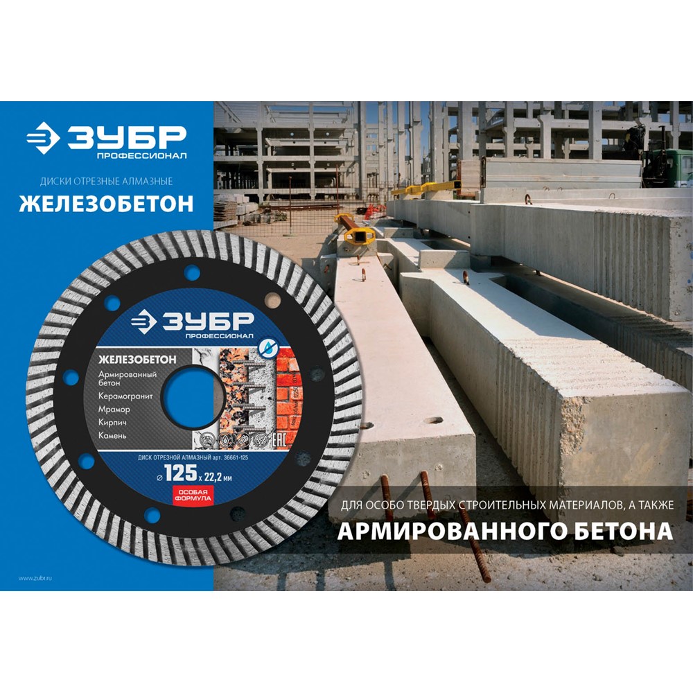 ЖЕЛЕЗОБЕТОН 125 мм, диск алмазный отрезной сегментированный по железобетону, армированному бетону, ЗУБР Профессионал