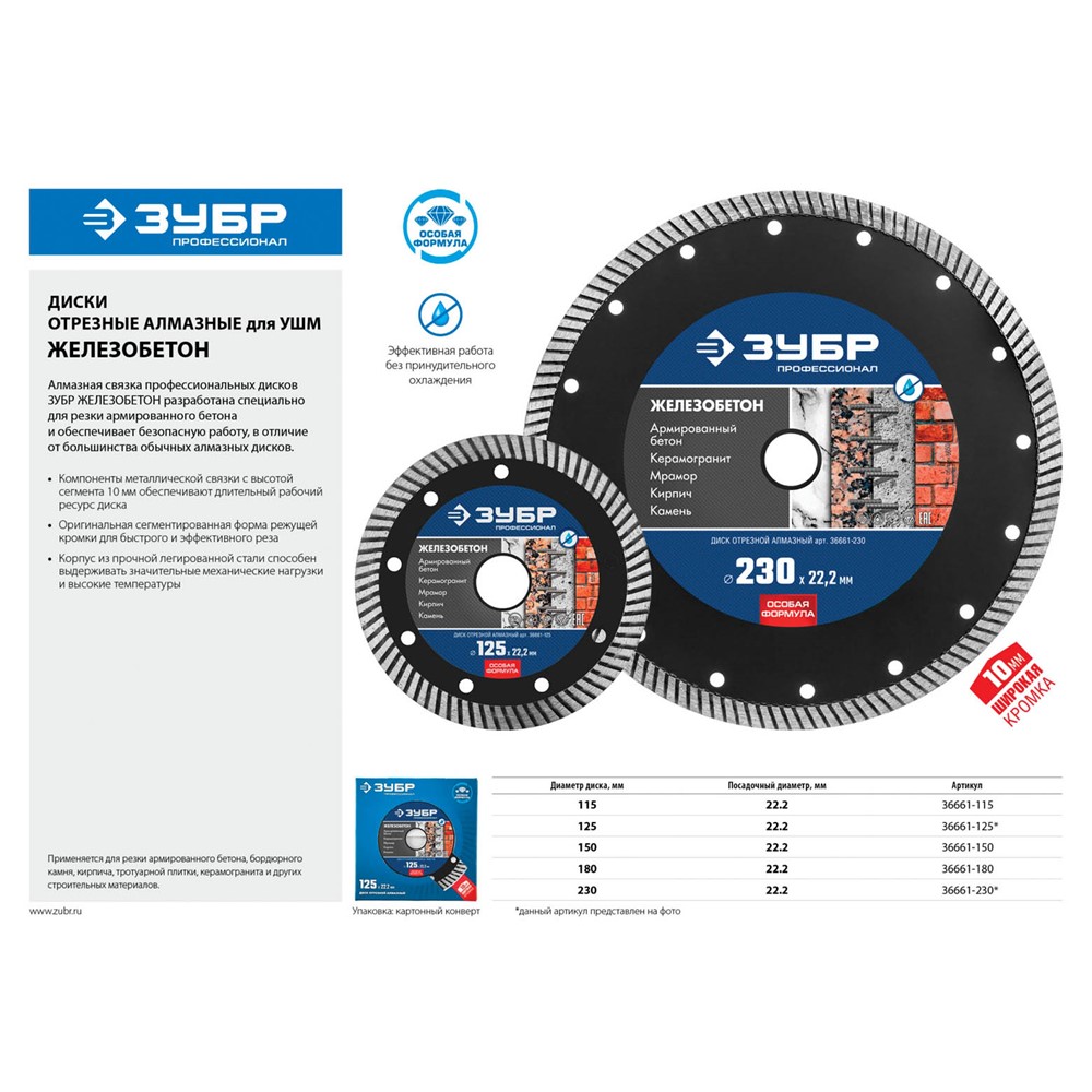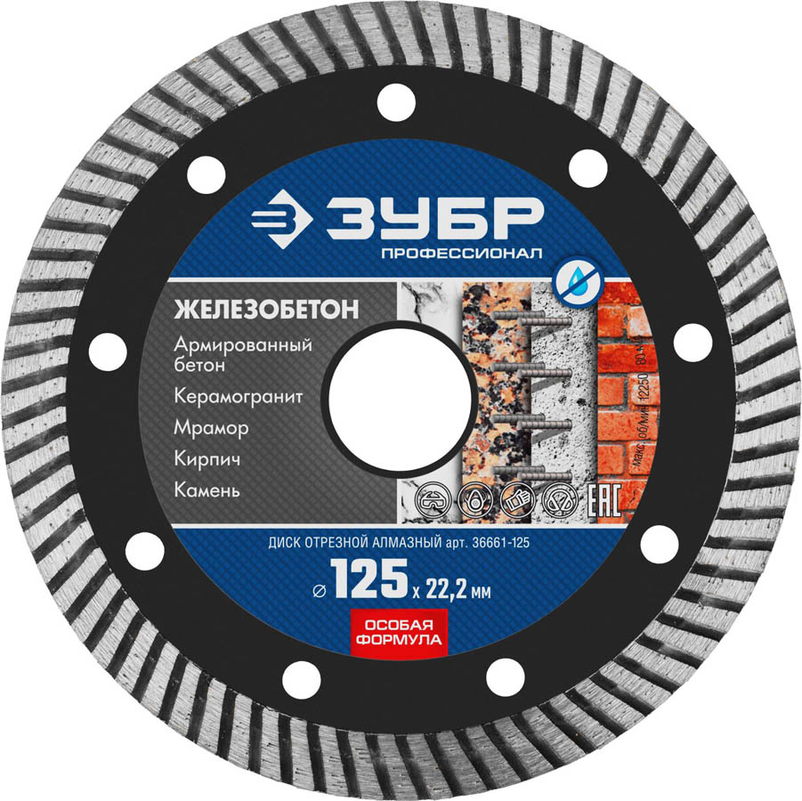Диск отрезной алмазный 125 х 22.2 мм, ЗУБР 36661-125, предназначен для резки армированного бетона, бордюрного камня, кирпича, тротуарной плитки, керамогранита и других строительных материалов без принудительного охлаждения. Оригинальная сегментированная форма режущей кромки позволяет быстро и эффективно осуществлять необходимые резы в обрабатываемом материале. Оптимально подобранные компоненты металлической связки с высотой сегмента в 10 мм гарантируют продолжительный рабочий ресурс круга при работе даже с самыми сложными в обработке материалами.