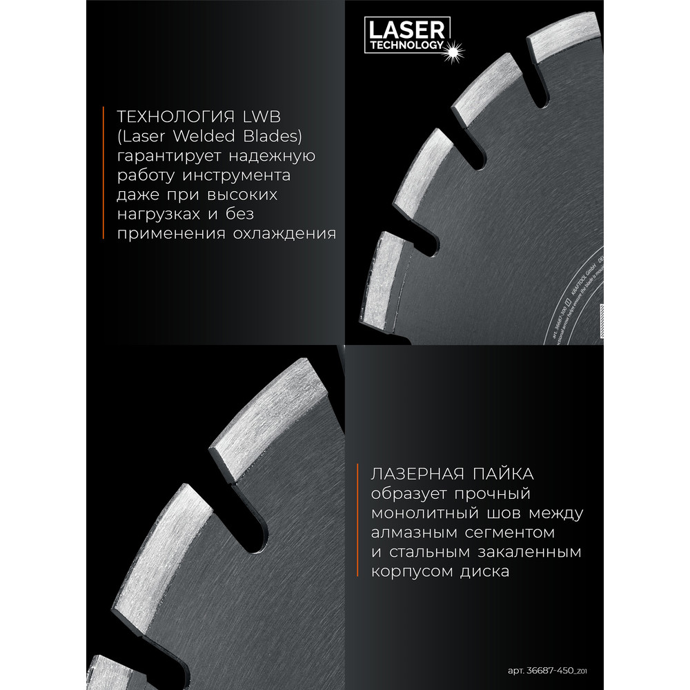 - Лазерная пайка образует прочный монолитный шов между алмазным сегментом и стальным закаленным корпусом диска