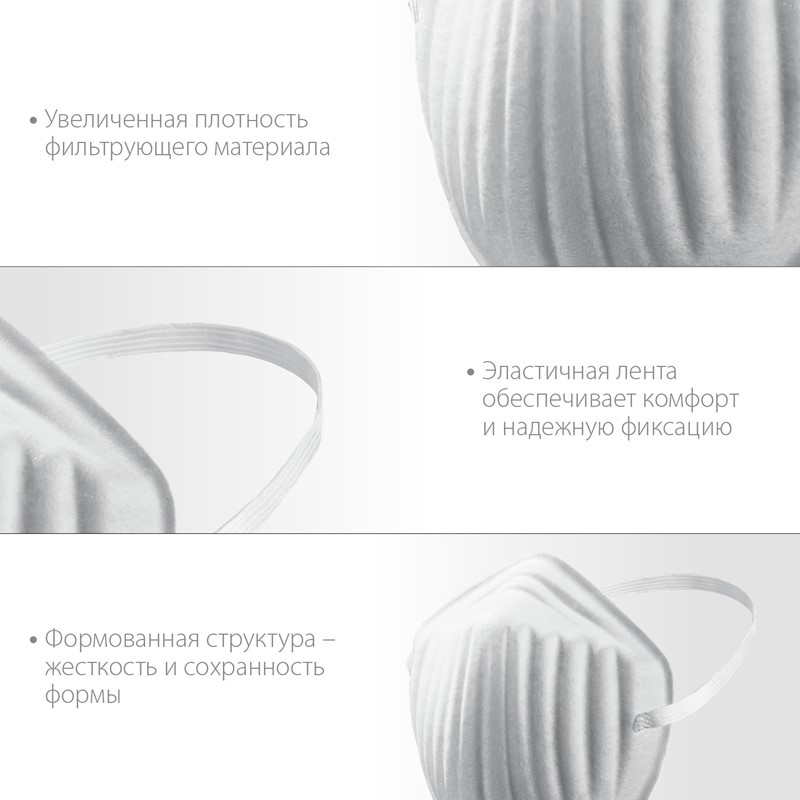 - Формованная структура маски обеспечивает жёсткость и сохранность формы при ношении