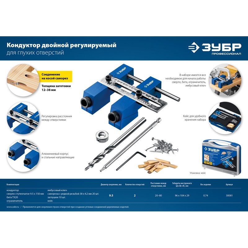 ЗУБР Кондуктор регулируемый для глухих отверстий, два отверстия, в кейсе