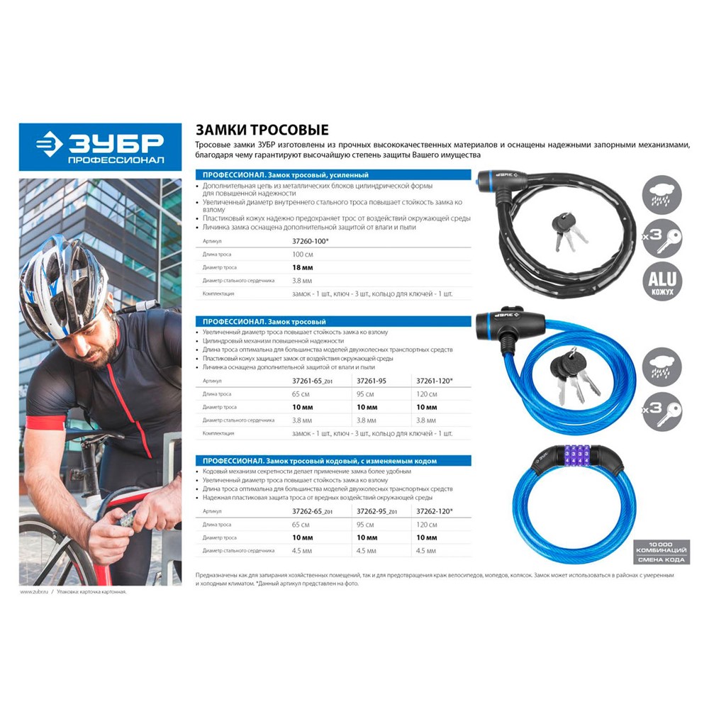 Тросовый замок Зубр 37261-120, предназначен как для запирания хозяйственных помещений, так и для предотвращения краж велосипедов, мопедов, колясок и др. Замок может использоваться в районах с умеренным и холодным климатом. Замки ЗУБР - классика в идеальном исполнении. Гарантия безопасности и надежности благодаря непрерывному контролю качества, высококлассным комплектующим и совершенному секретному механизму. Стальной трос увеличенного диаметра обеспечивает высокую защищенность. Замок оснащает цилиндровым механизмов повышенной надежности. Трос оптимальной длины позволяет использовать данный замок с большинством моделей двухколесных транспортных средств. Пластиковый кожух обеспечивает дополнительную защиту от взлома и защищает замок от воздействия окружающей среды. Личинка замка оснащена дополнительной защитой от влаги и пыли.
