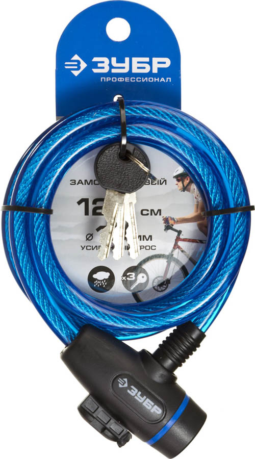Замок ЗУБР "ПРОФЕССИОНАЛ", тросовый, 3 ключа в комплекте, длина троса 1200мм, d 10мм