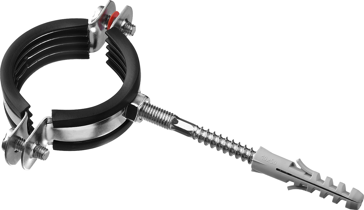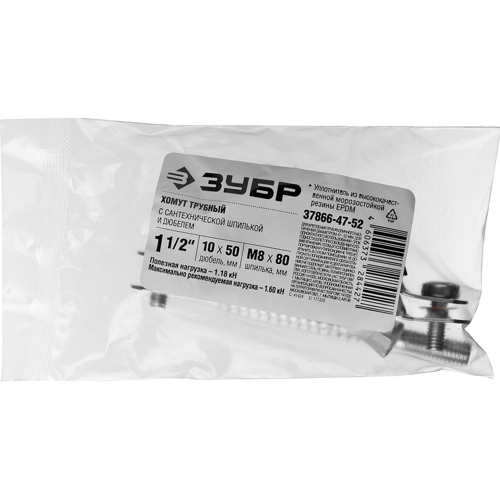 Хомут трубный с гайкой, оцинкованный, в комплекте с сантехнической шпилькой и дюбелем, 1 1/2", 1шт, ЗУБР