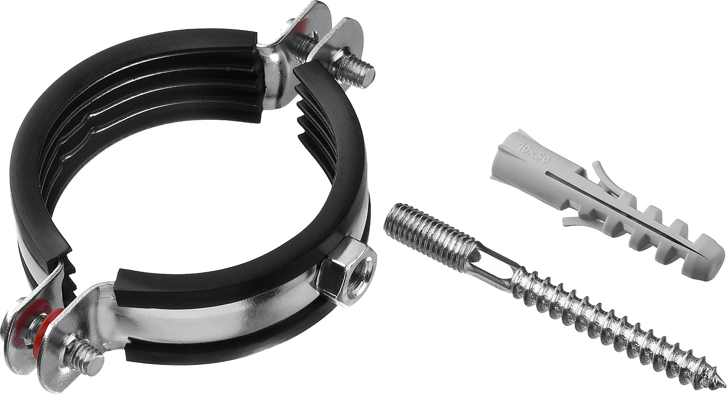 Хомут трубный с гайкой, оцинкованный, в комплекте с сантехнической шпилькой и дюбелем, 2", 1шт, ЗУБР