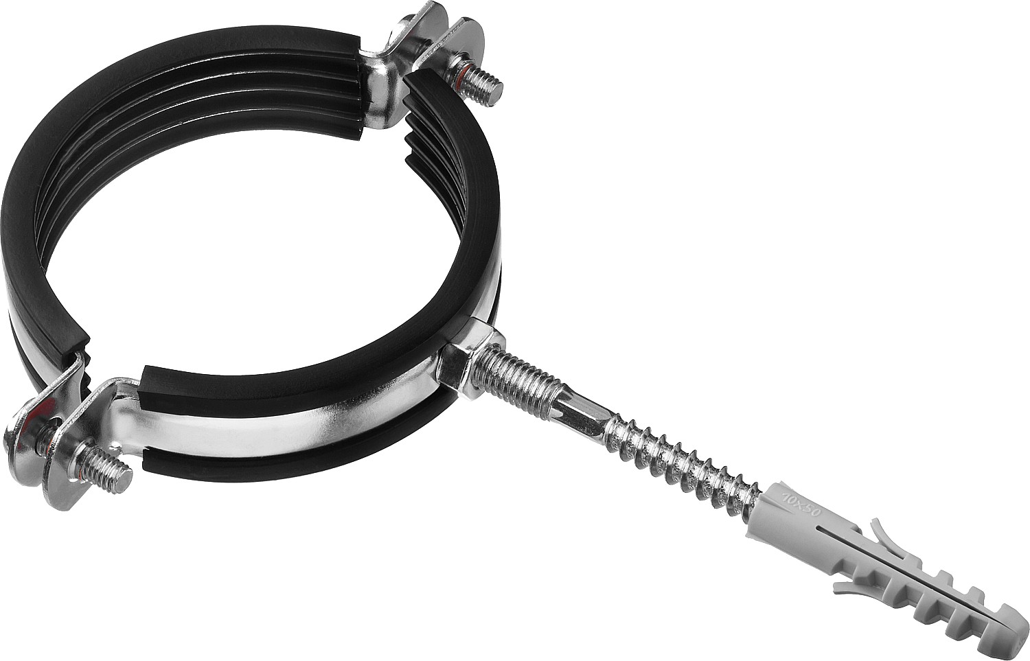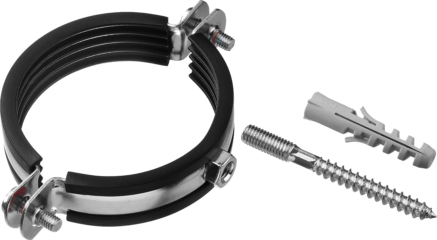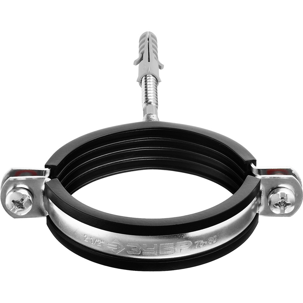 Хомут трубный с гайкой, оцинкованный, в комплекте с сантехнической шпилькой и дюбелем, 2 1/2", 1шт, ЗУБР