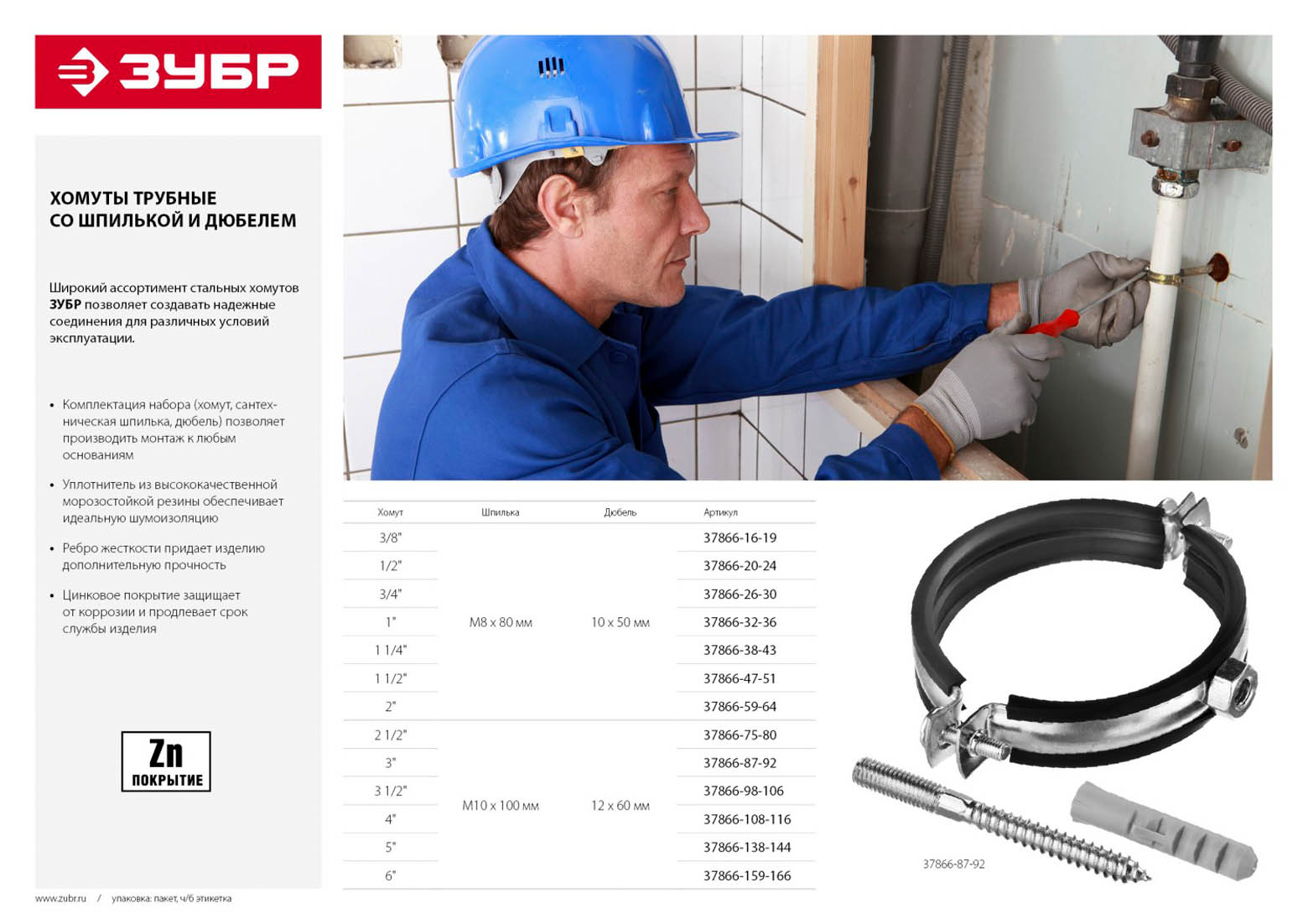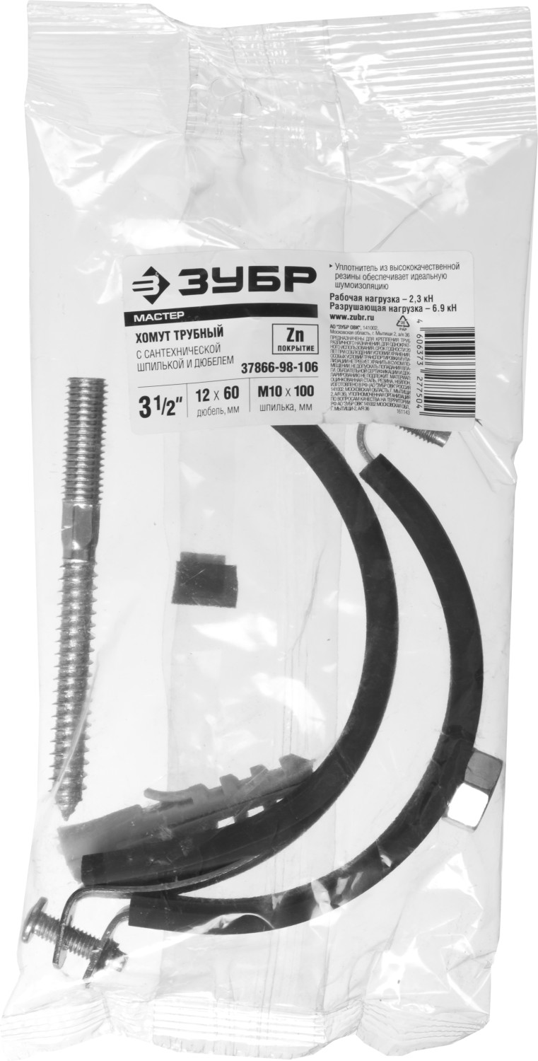 ЗУБР 3 1/2", 1 шт., оцинкованный, в комплекте с сантехнической шпилькой и дюбелем, хомут трубный с гакой 37866-98-106