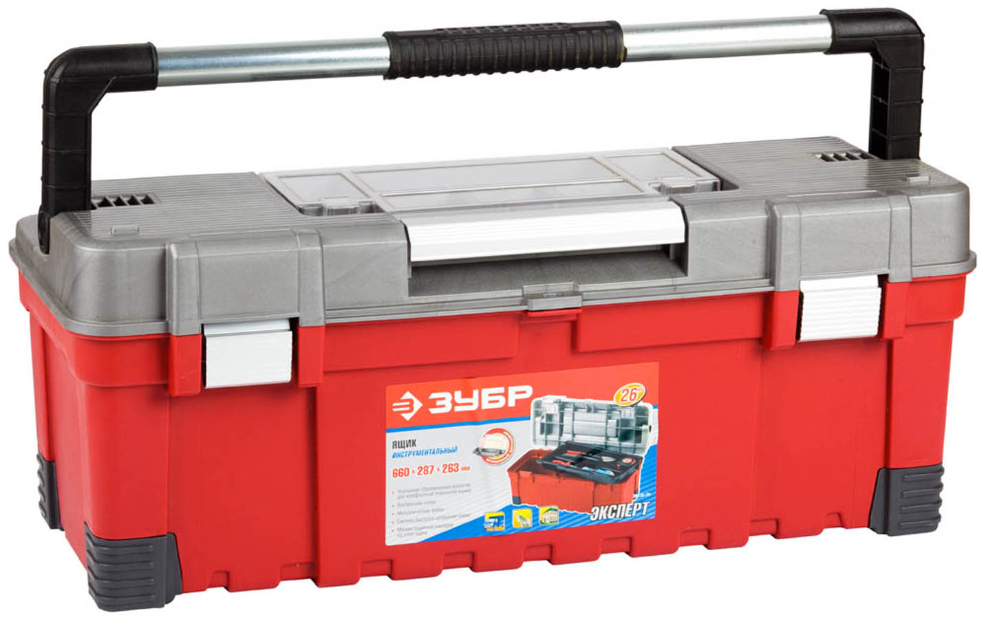 Ящик для инструмента ЗУБР 38135-26, применяется для хранения инструментов и принадлежностей. Съемная полка для размещения мелких предметов или самых востребованных инструментов. Встроенный съемный органайзер для хранения и переноски метизов и расходных материалов. Металлические замки для надежного запирания ящика во время переноски. Широкая металлическая ручка для регулировки центра тяжести ящика при переноске.