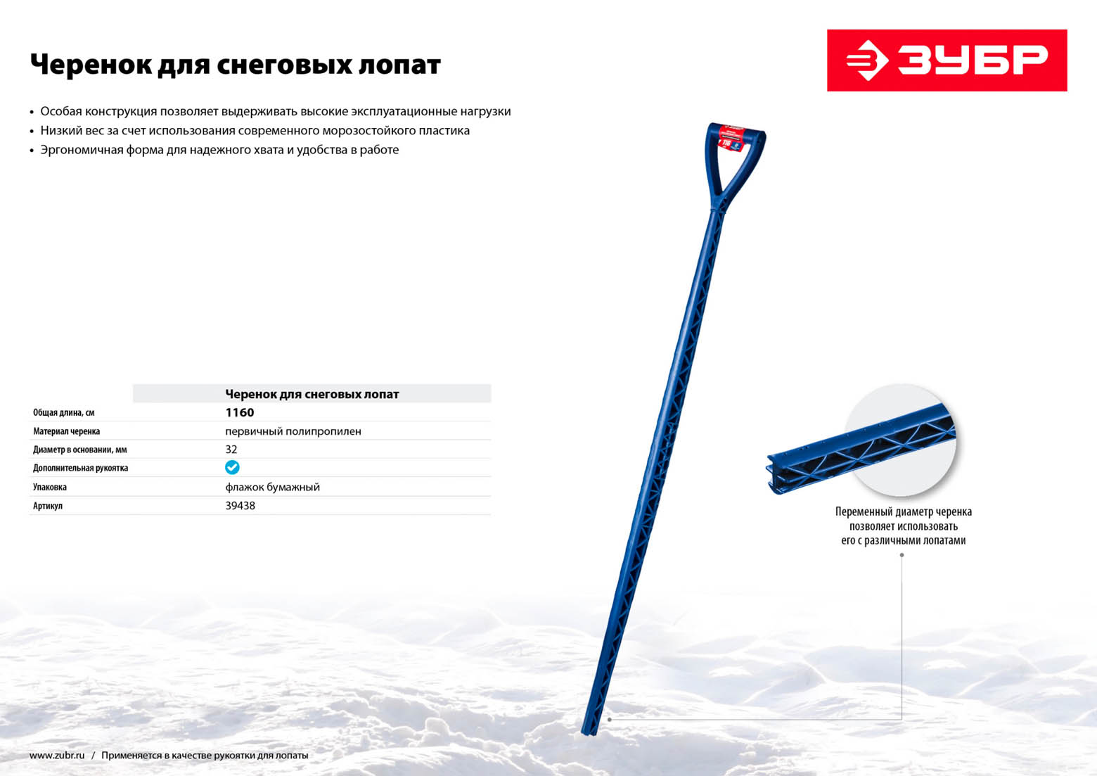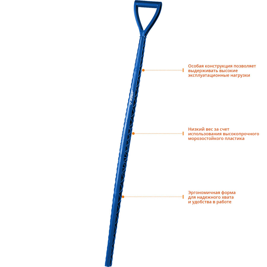 Черенок экстрапрочный пластиковый морозостойкий ЗУБР 39438, предназначен для крепления к снеговым лопатам.