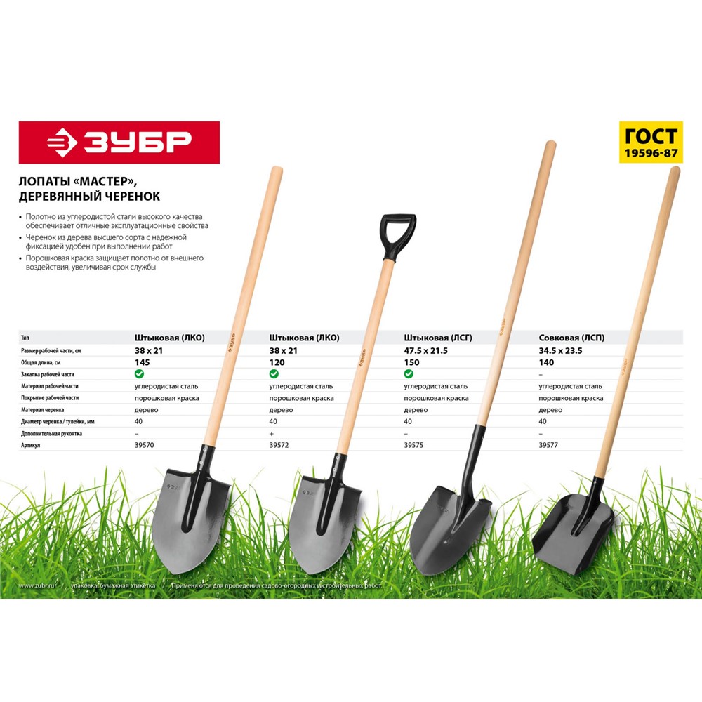 Лопата штыковая ЗУБР 39575, используется для проведения садово-огородных и строительных работ. Штыковая лопата является простым и универсальным инструментом для широкого фронта работ, от перекопки твердых почв до перерезания небольших корней. Закаленная углеродистая сталь. Черенок высшего сорта. Надежное защитное покрытие.