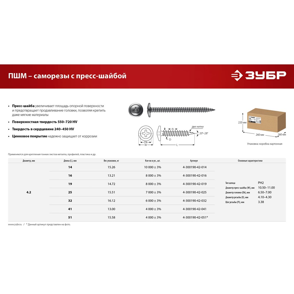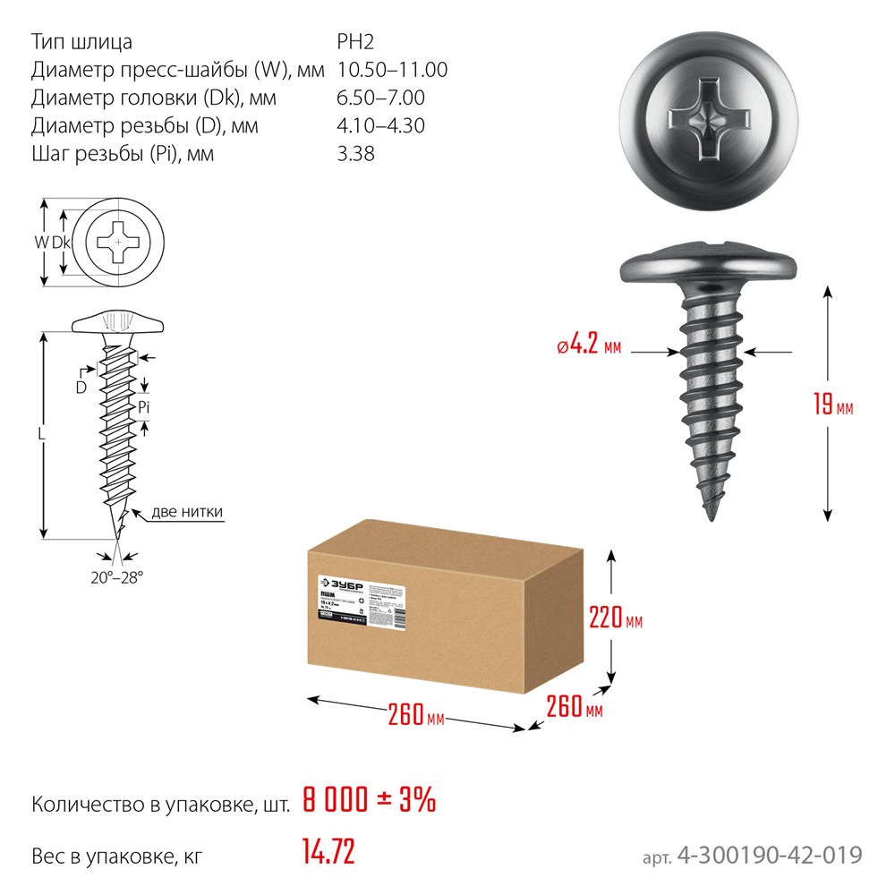 ЗУБР ПШМ 19 х 4.2 мм, Саморез с пресс-шайбой, цинк, 14.72 кг (4-300190-42-019)