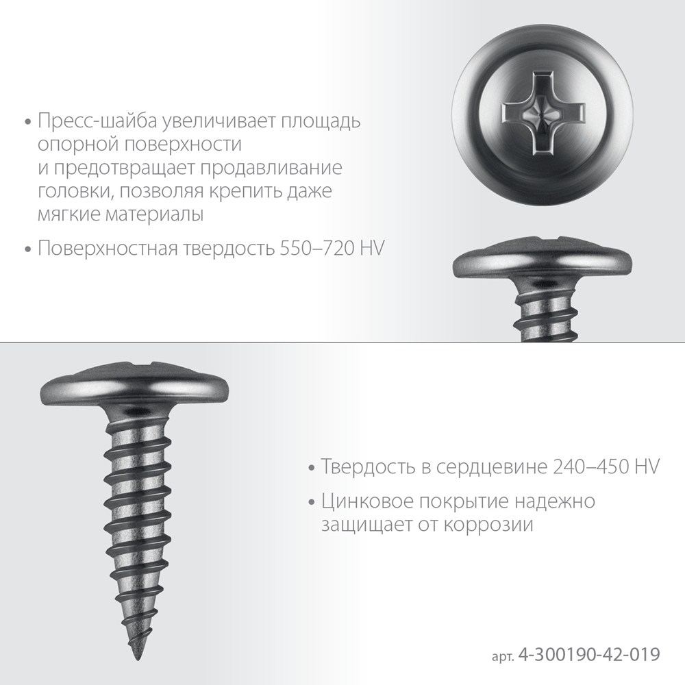 - Пресс-шайба увеличивает площадь опорной поверхности и предотвращает продавливание головки, благодаря чему саморезами можно крепить даже мягкие материалы.