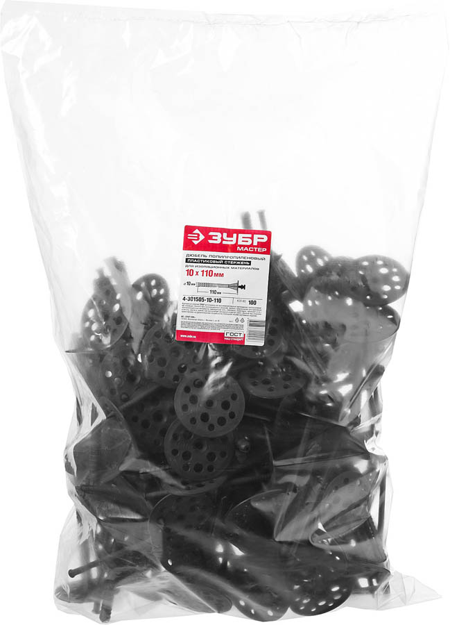 Дюбель для изоляционных материалов полипропиленовый, пластиковый стержень, 10 x 110 мм, 100 шт, ЗУБР