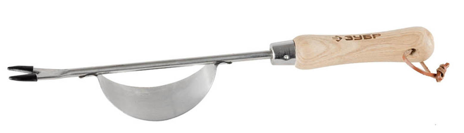 Корнеудалитель ЗУБР 4-39469, применяется для полного удаления сорняковых растений. Прочная рабочая часть изготовлена из высококачественной закалённой нержавеющей стали, не ломается и не гнётся, не подвержена коррозии. Острая вилочка корнеудалителя легко проникает в землю, прочно захватывая корни сорняков между зубьями. Эргономичная рукоятка из твёрдой древесины высшего сорта обеспечивает удобный хват. Лаковое покрытие рукоятки надёжно защищает от влаги и увеличивает срок службы инструмента. На рукоятке имеется кожаная петелька для подвешивания инструмента.