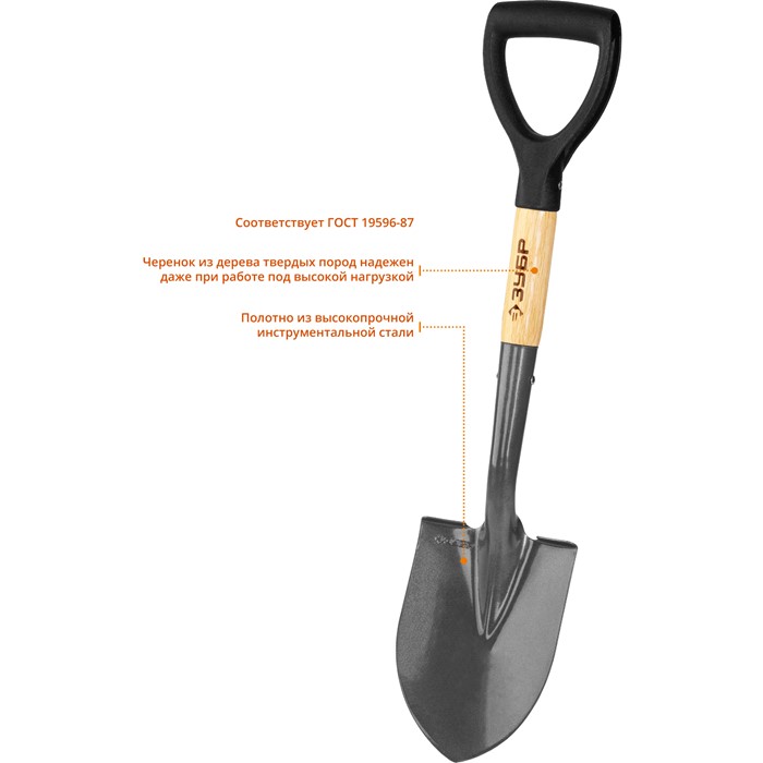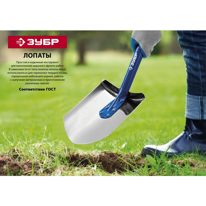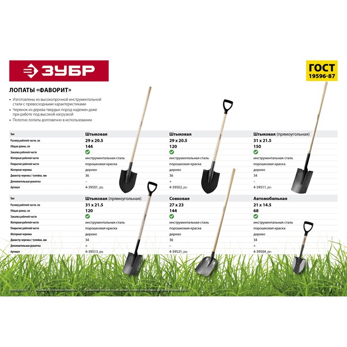 - Тип - автомобильная. Лезвие изготовлено из 50Mn углеродистой стали толщиной 1,6 мм. Размер 210х145х680 мм. Твердость 40-50 HRC. Лезвие заострено. Защитное покрытие - порошковая краска серый металлик. Наступ вперед. Штамп лого ЗУБР. Черенок из ясеня высшего сорта (без сучков, шлифованный, покрытый матовым прозрачным лаком, влажность 10-14%, лого ЗУБР - выжжен на черенке). Пластиковая D-образная рукоятка.