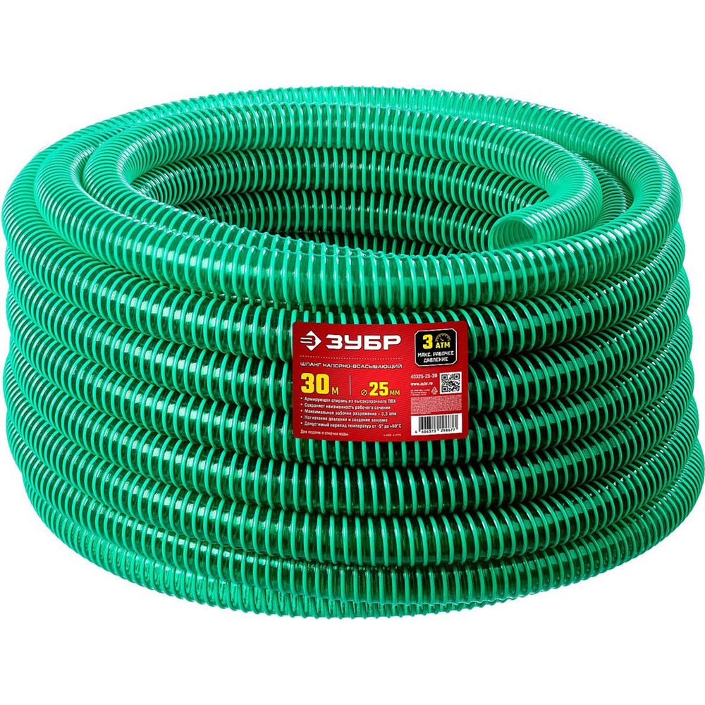 ЗУБР 25 мм x 30 м, 180 гр/м, со спиралью ПВХ, 3 атм., шланг напорно-всасывающий 40325-25-30