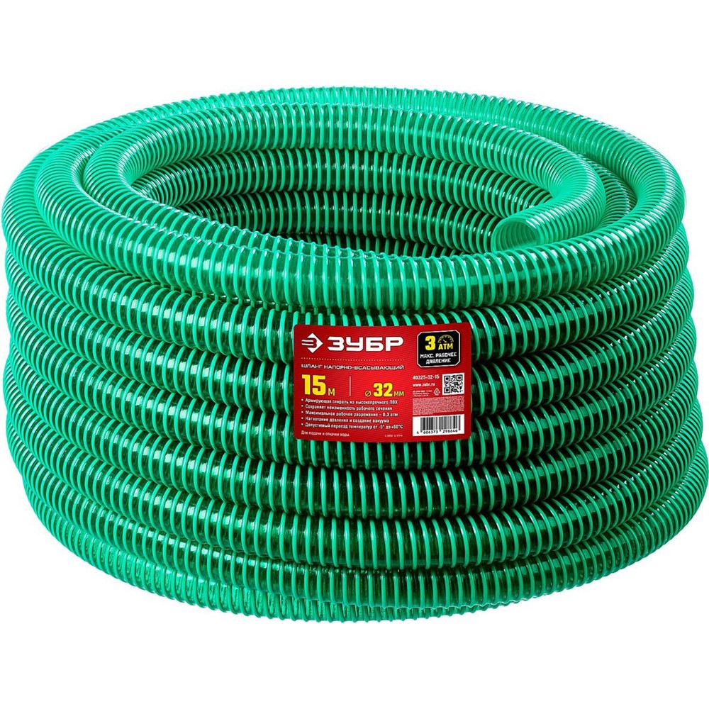 ЗУБР 32 мм x 15 м, 240 гр/м, со спиралью ПВХ, 3 атм., шланг напорно-всасывающий 40325-32-15