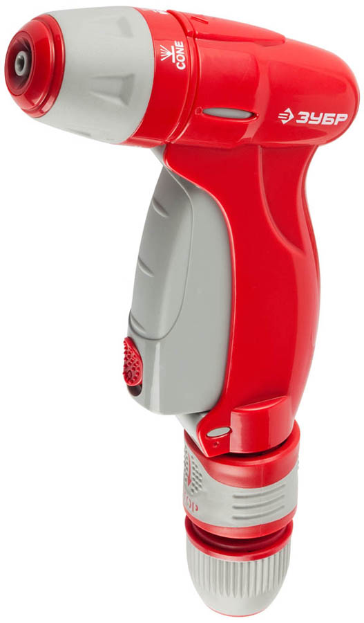 Пистолет-распылитель ЗУБР 40411, применяется для полива растений и для очистки различных поверхностей от грязи. Пистолет-распылитель и соединитель изготовлены из ударопрочного пластика. Пистолет-распылитель имеет эргономичную форму. Соединитель имеет удлинённую муфту, которая предотвращает перегиб шланга. Запирающий механизм соединителя исключает самопроизвольное отсоединение от пистолета-распылителя. Элементы из термопластичной резины предотвращают проскальзывание изделия в руке. Наличие 5-ти форм водяной струи и 2-х режимов подачи воды позволяют выбрать наиболее удобный и эффективный способ полива. Наличие в соединителе автостопа позволяет перекрывать / пускать подачу воды снятием / надеванием поливочной насадки.