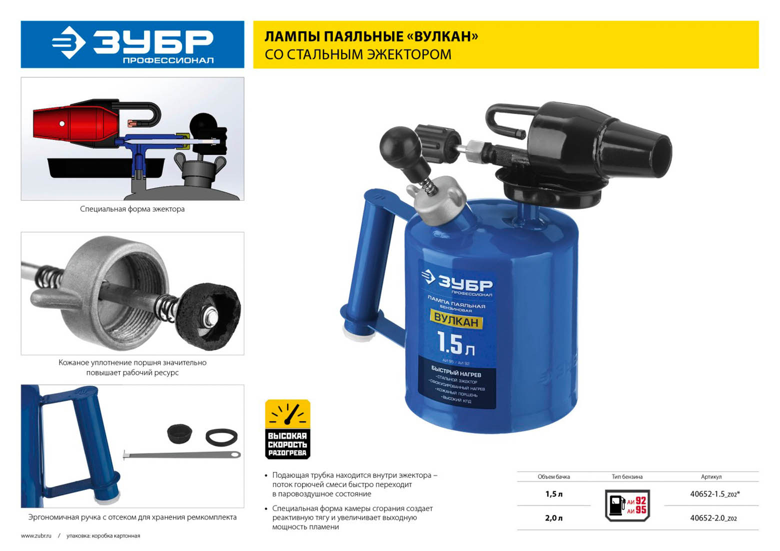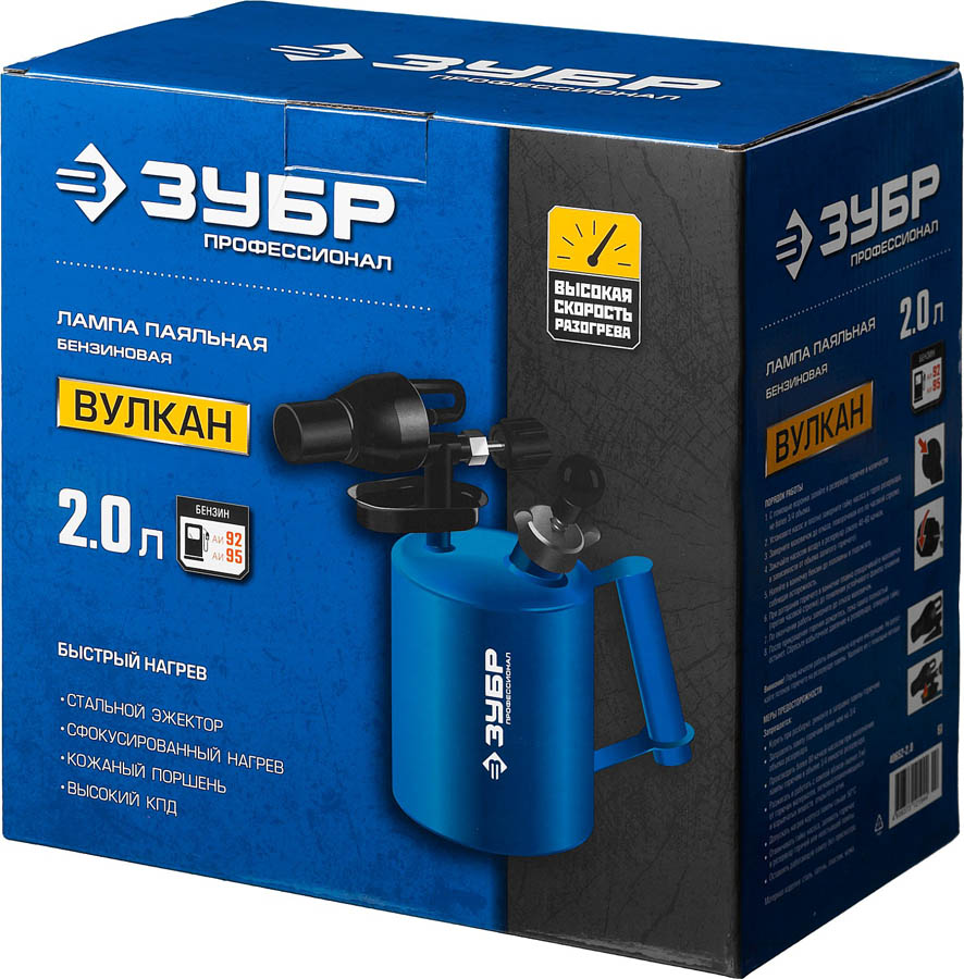 ЗУБР "ПРОФЕССИОНАЛ". Лампа паяльная ВУЛКАН, со стальным эжектором, 2,0 л