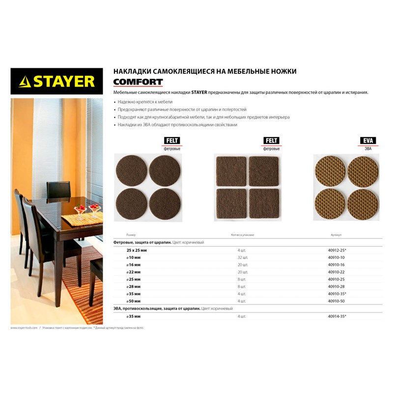 Накладки STAYER "COMFORT" на мебельные ножки, самоклеящиеся, фетровые, коричневые, круглые - диаметр 10 мм, 32 шт