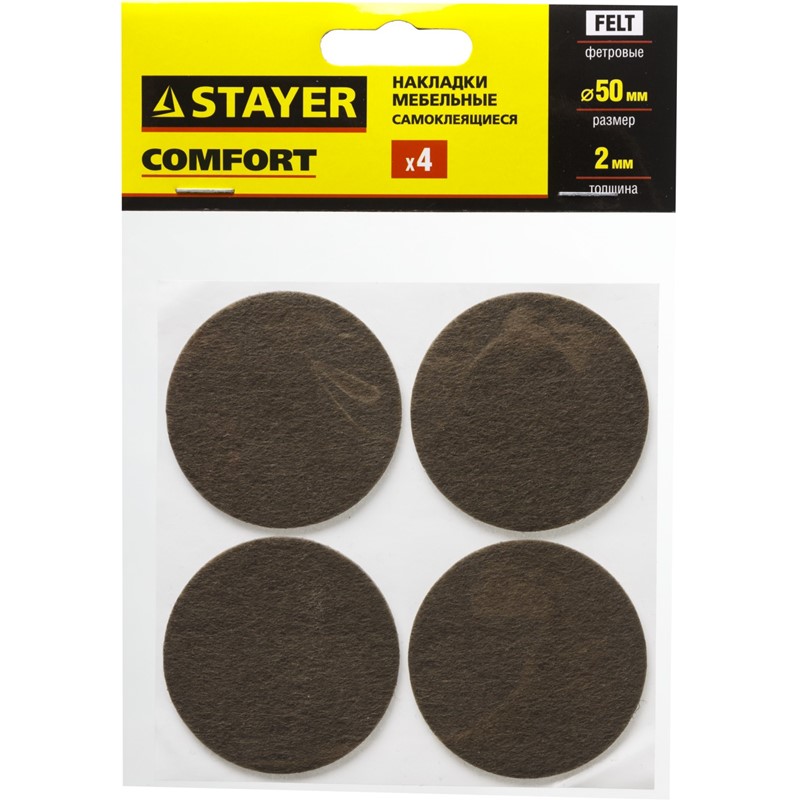 Накладки STAYER "COMFORT" на мебельные ножки, самоклеящиеся, фетровые, коричневые, круглые - диаметр 50 мм, 4 шт