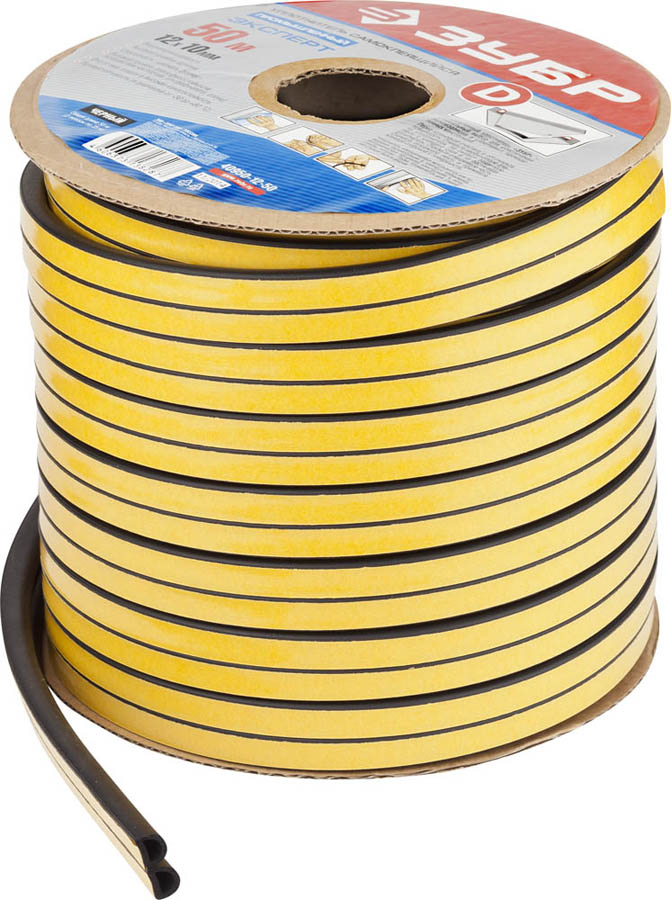 Уплотнитель ЗУБР "ЭКСПЕРТ" промышленный, самоклеящийся, черный, D-профиль, на бобине, 12ммх10мм, 50м
