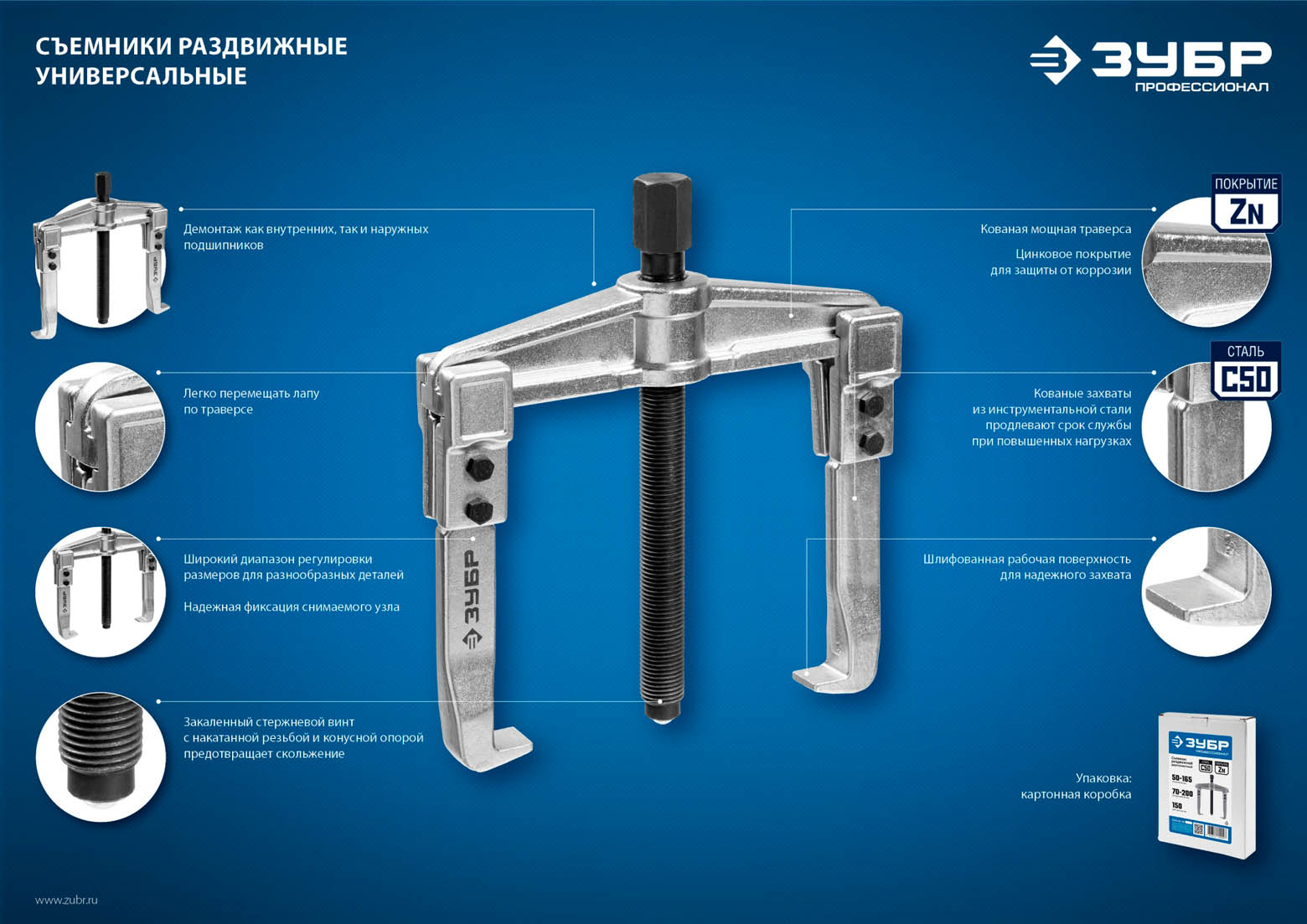 Съемник раздвижной 2-захватный, 150 мм, ЗУБР Профессионал 43310-200-150